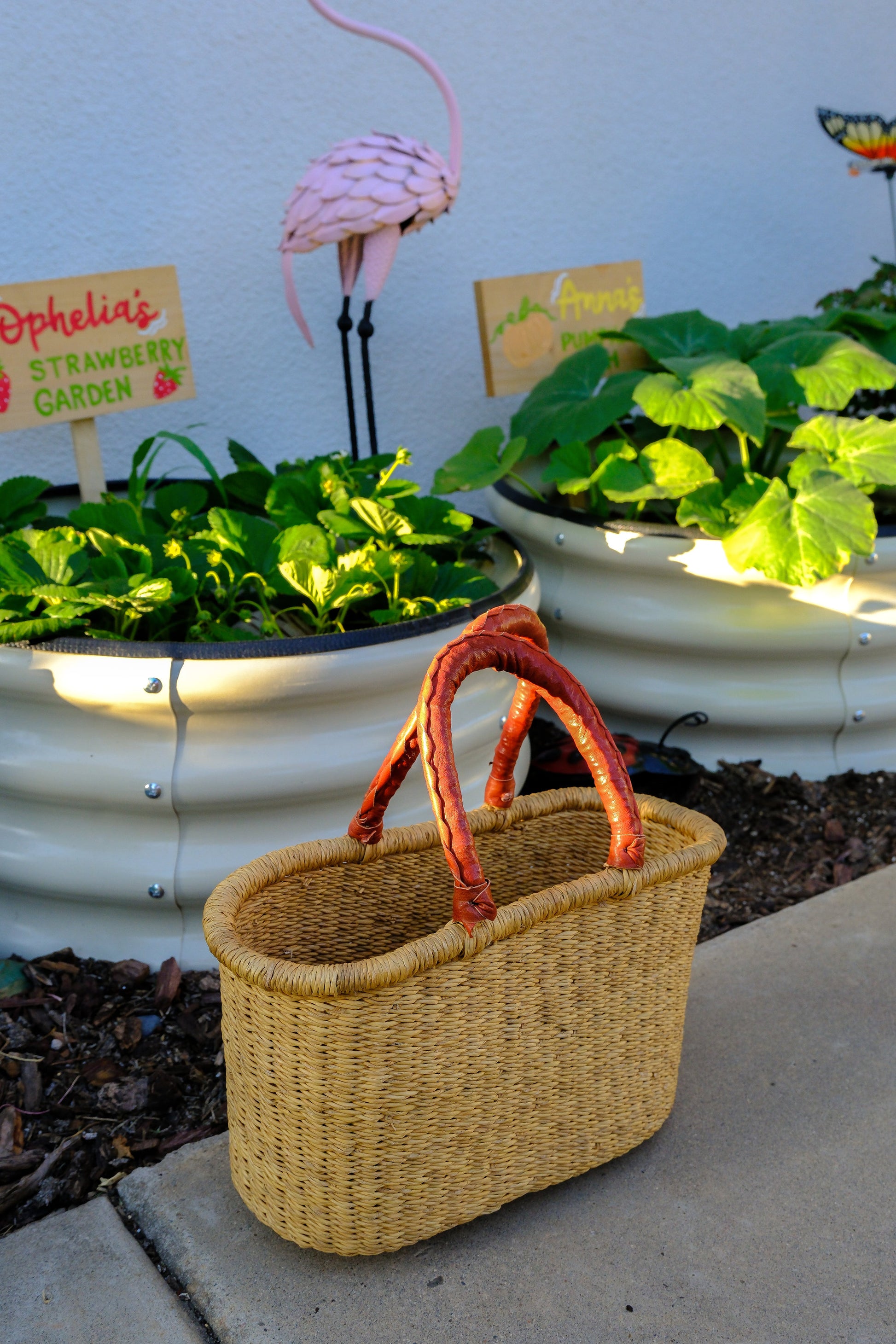 From garden to table with a skip in your step! Our Harvest Basket is the perfect companion for your garden-harvesting expeditions. This natural woven oval basket doesn't just look adorable—it's ready to cradle your freshly picked fruits, veggies, and flowers with care. Swing those leather-wrapped handles all the way to the farmers market or use this charming carrier as stylish storage when the harvesting day is done. Who said functional can't be fun?