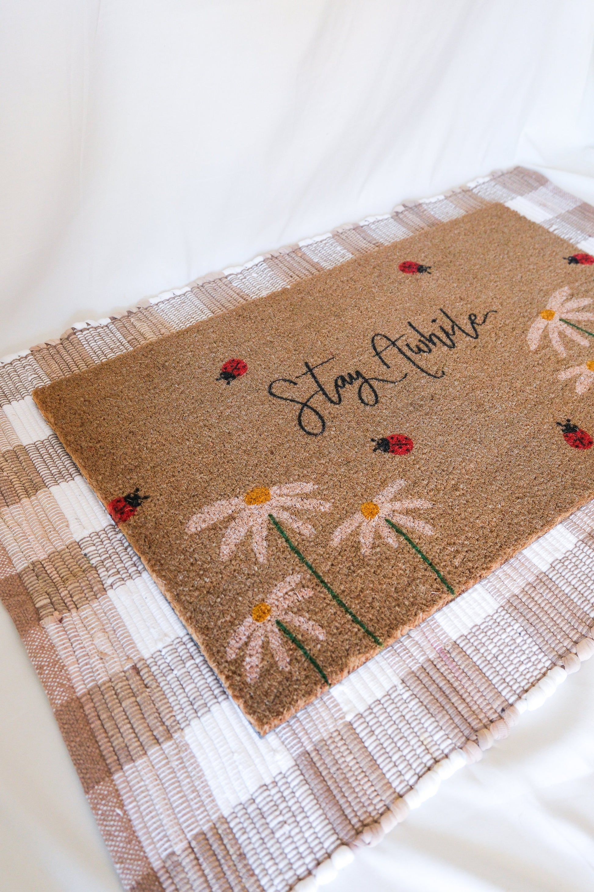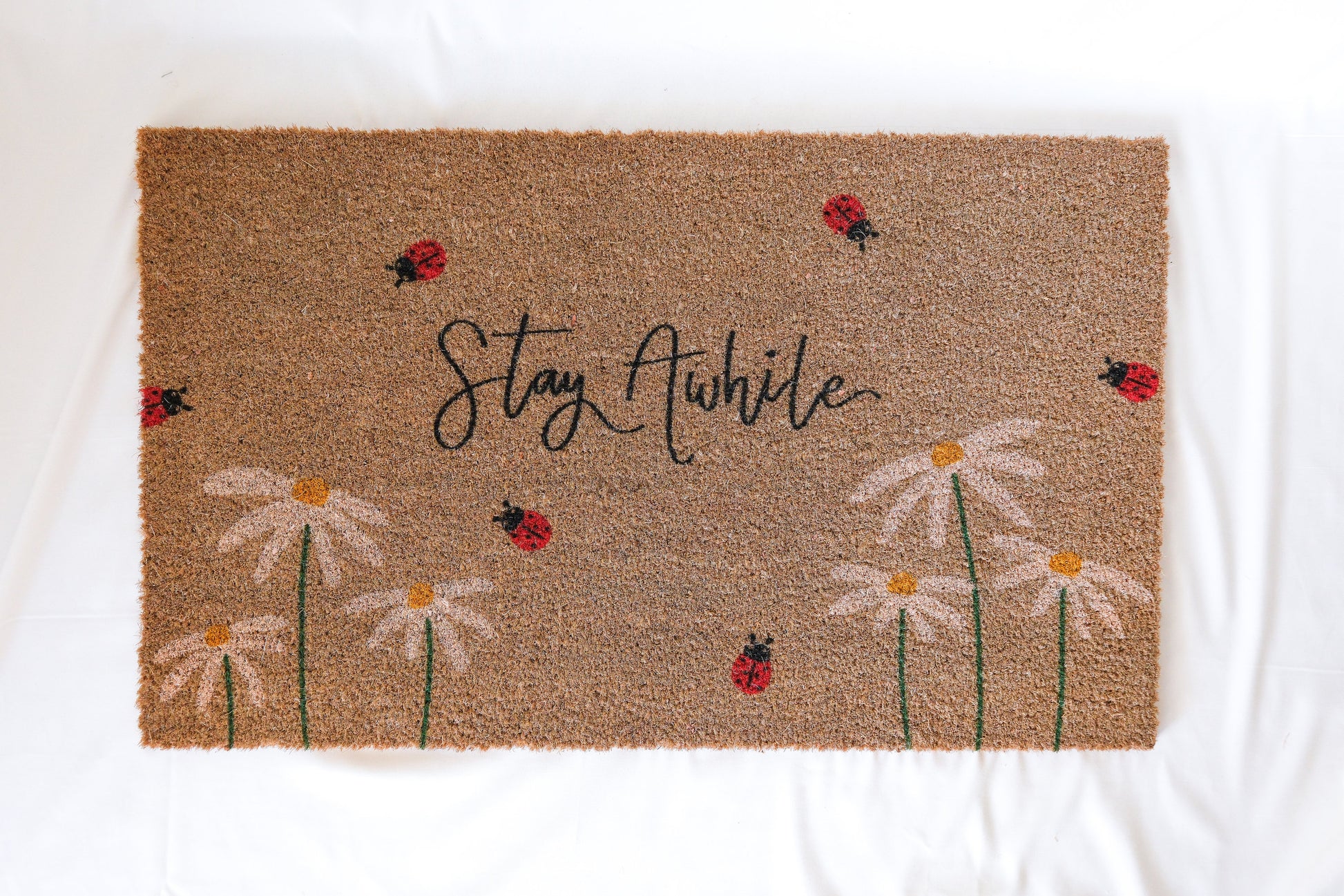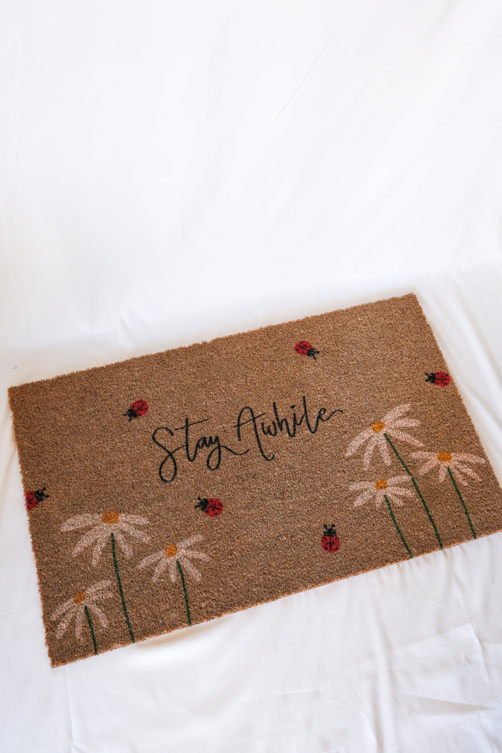 Welcome your guests with a little garden inspo using our Stay Awhile Doormat! Featuring a cute flower and ladybug design, this doormat adds a touch of charm to your doorstep. Encourage visitors to linger a little longer with this playful addition to your home.